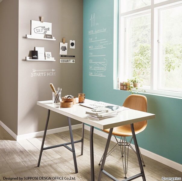 エンボスへの工夫と表面のフィルムにより、黒板のようにチョークで書き消しできる壁紙です。