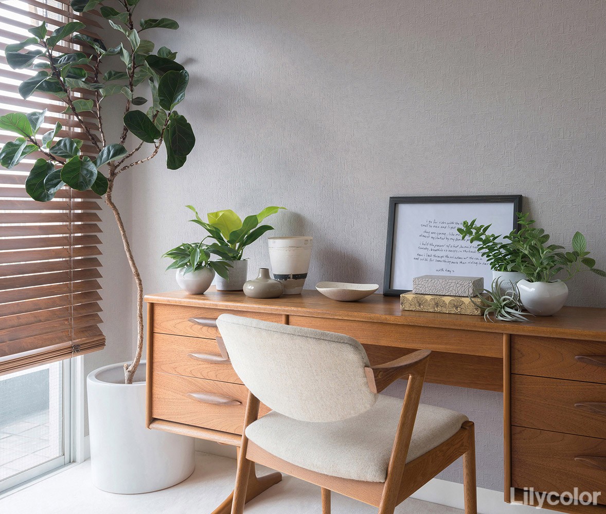 コテ塗りの表情を再現した漆喰調の壁紙。