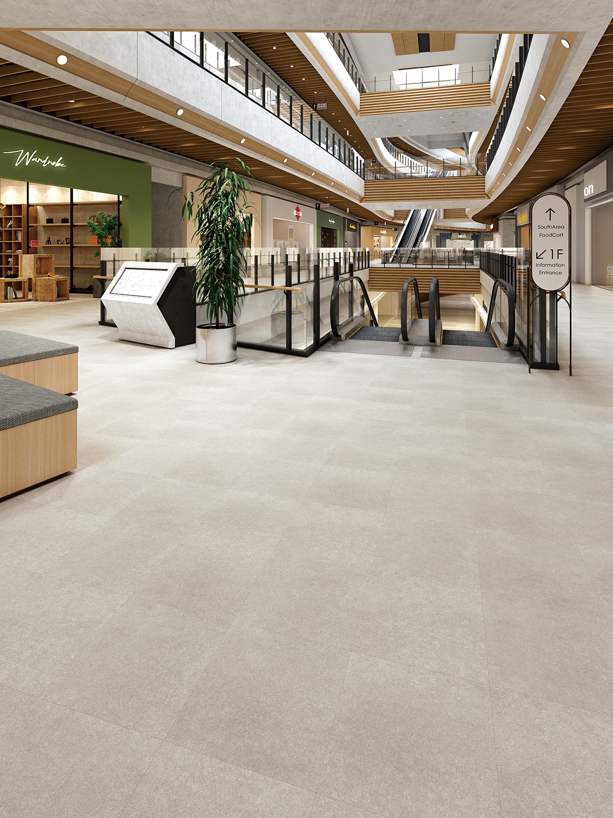 質感が際立つライムストーン柄に、なめらかなモルタルの要素を組み合わせたデザイン。
