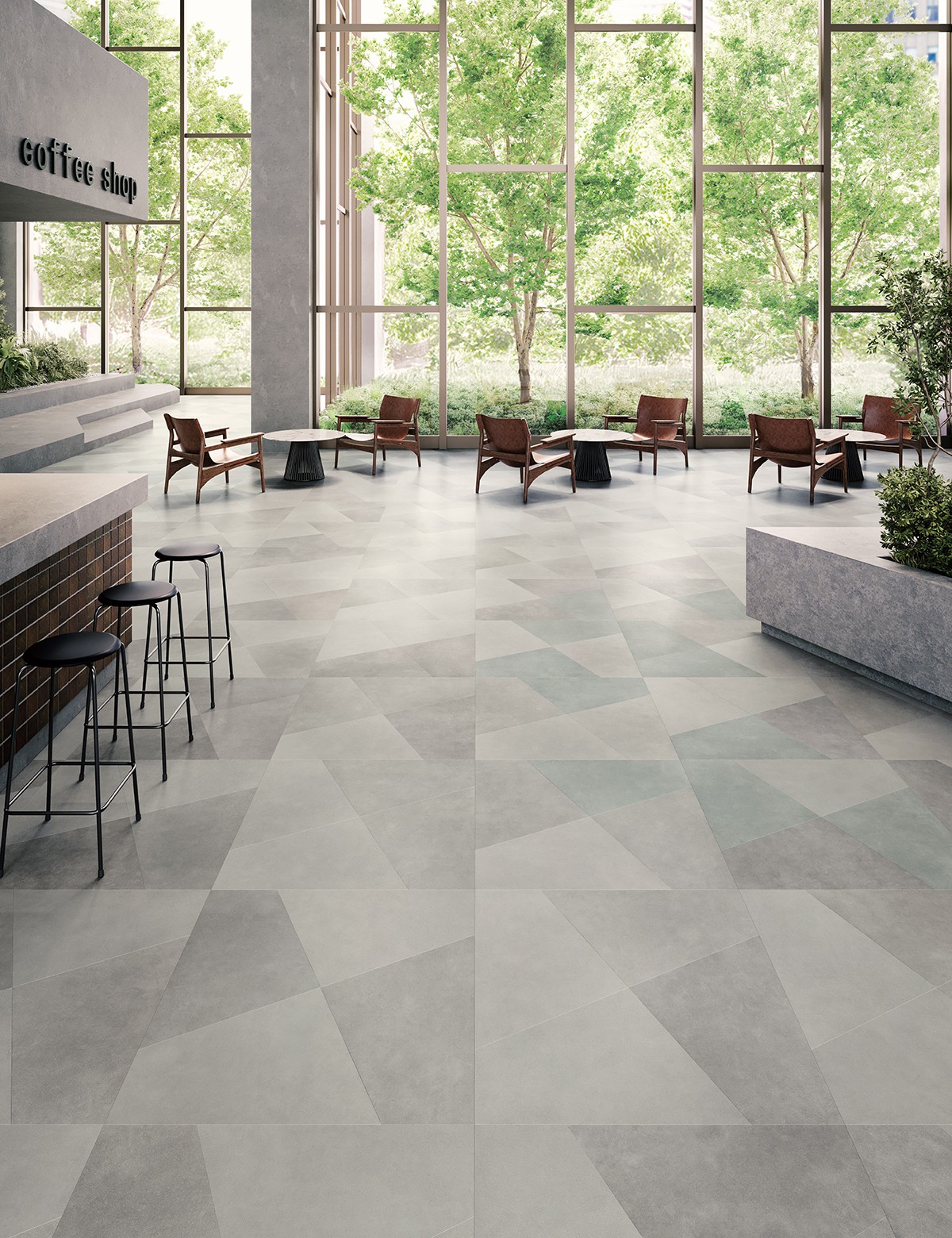 ミックス貼りでフロアをユニークに演出するなめらかなコンクリート柄。