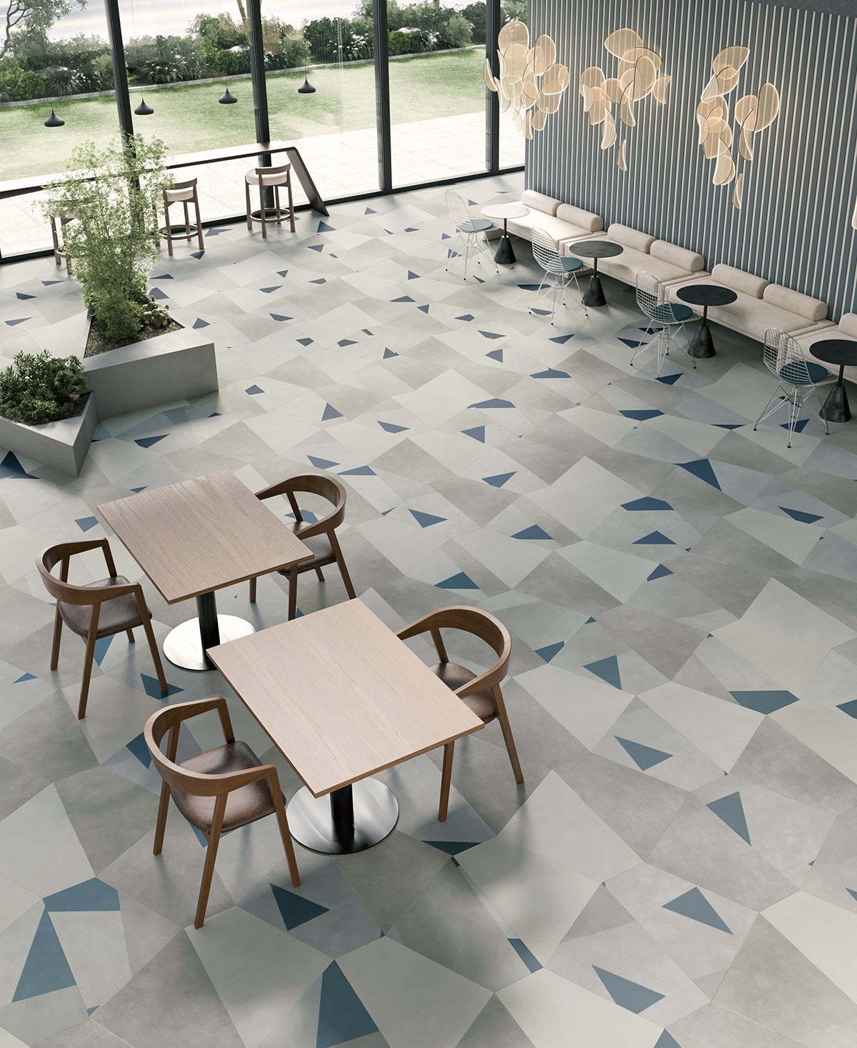 ミックス貼りでフロアをユニークに演出するなめらかなコンクリート柄。