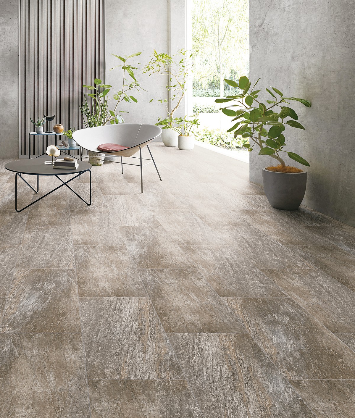 石の質感とナチュラルな家具を織り交ぜた洗練されたモダンリビング。コンクリートと岩石は一見クールでラグジュアリーなイメージですが、家具や床材をナチュラルなものにすることでリラックス空間にもなります。