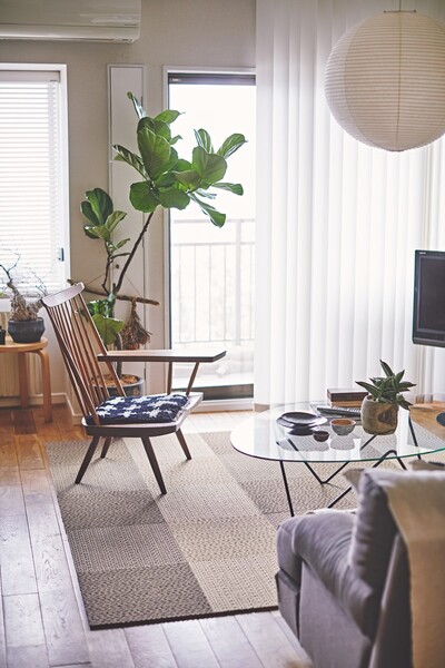 石の質感とナチュラルな家具を織り交ぜた洗練されたモダンリビング。コンクリートと岩石は一見クールでラグジュアリーなイメージですが、家具や床材をナチュラルなものにすることでリラックス空間にもなります。