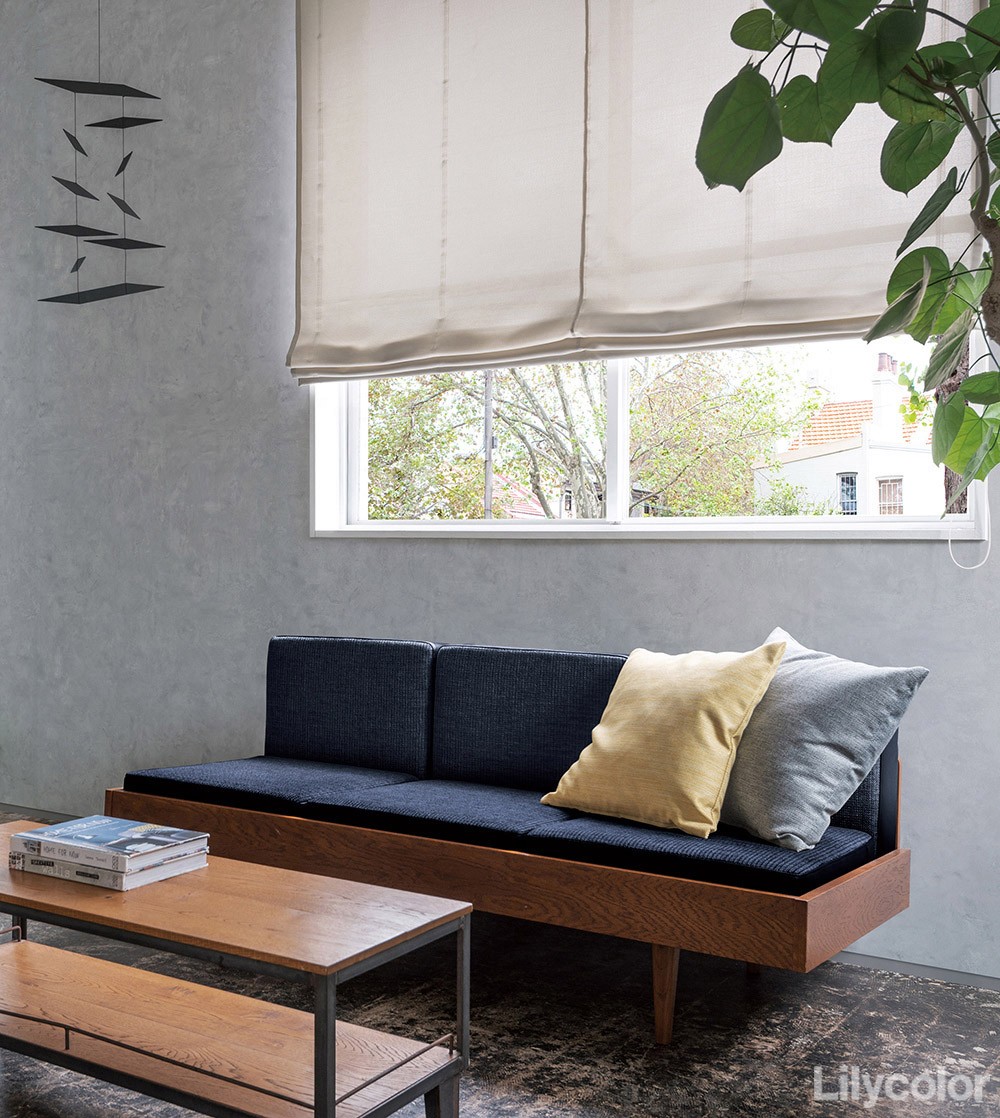 石の質感とナチュラルな家具を織り交ぜた洗練されたモダンリビング。コンクリートと岩石は一見クールでラグジュアリーなイメージですが、家具や床材をナチュラルなものにすることでリラックス空間にもなります。
