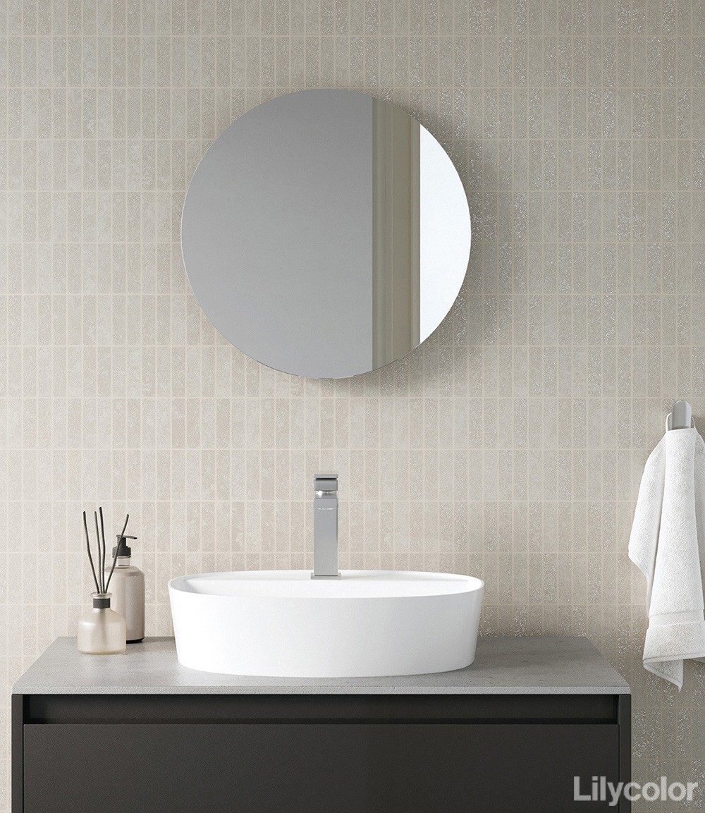 縦貼りしたボーダータイルをトーン・オン・トーンで表現しました。