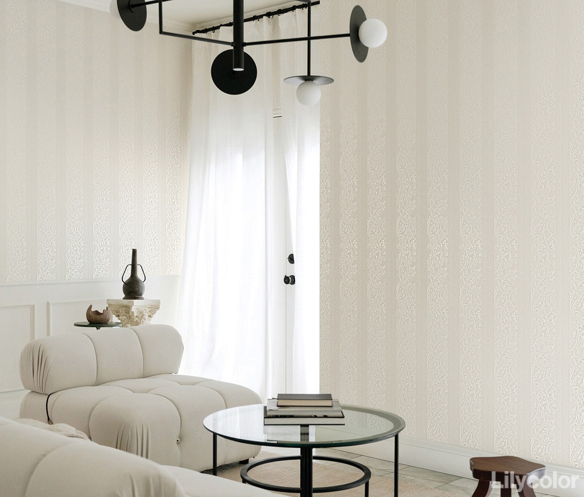 模様をパールで浮かび上がらせ、ホワイトでまとめた上品な壁紙です。