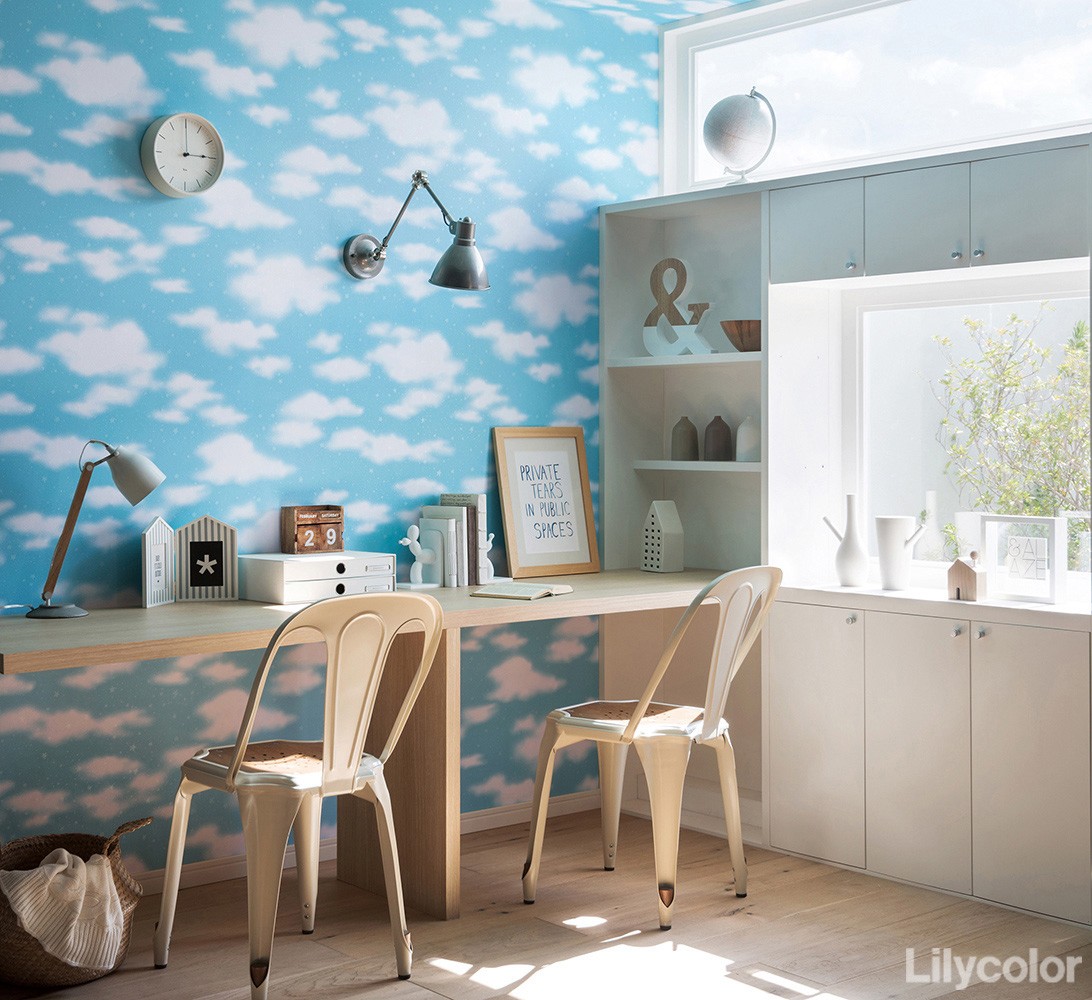 消灯後は星柄が浮かび上がる空柄の蓄光壁紙です。