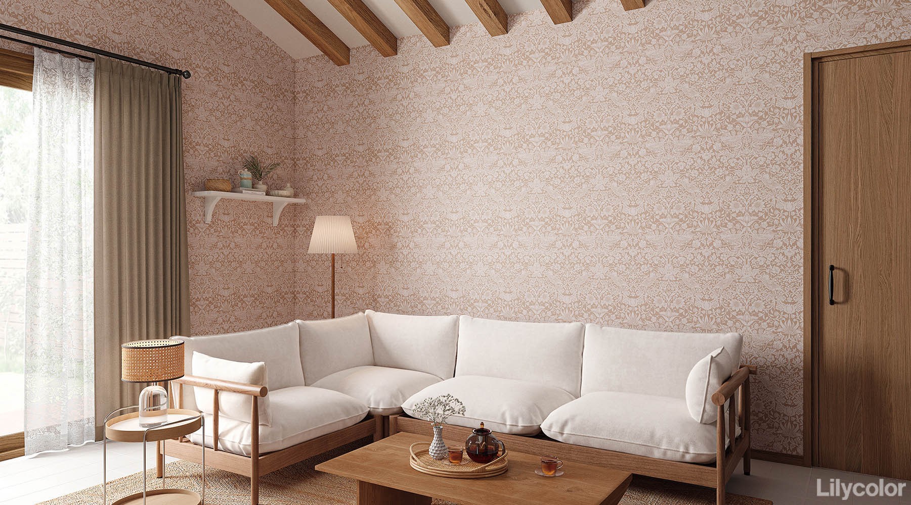 人気のいちご泥棒のデザインを優しい色調のトーン・オン・トーンで表現し、空間に落とし込みやすいアクセントクロスとして展開しています。