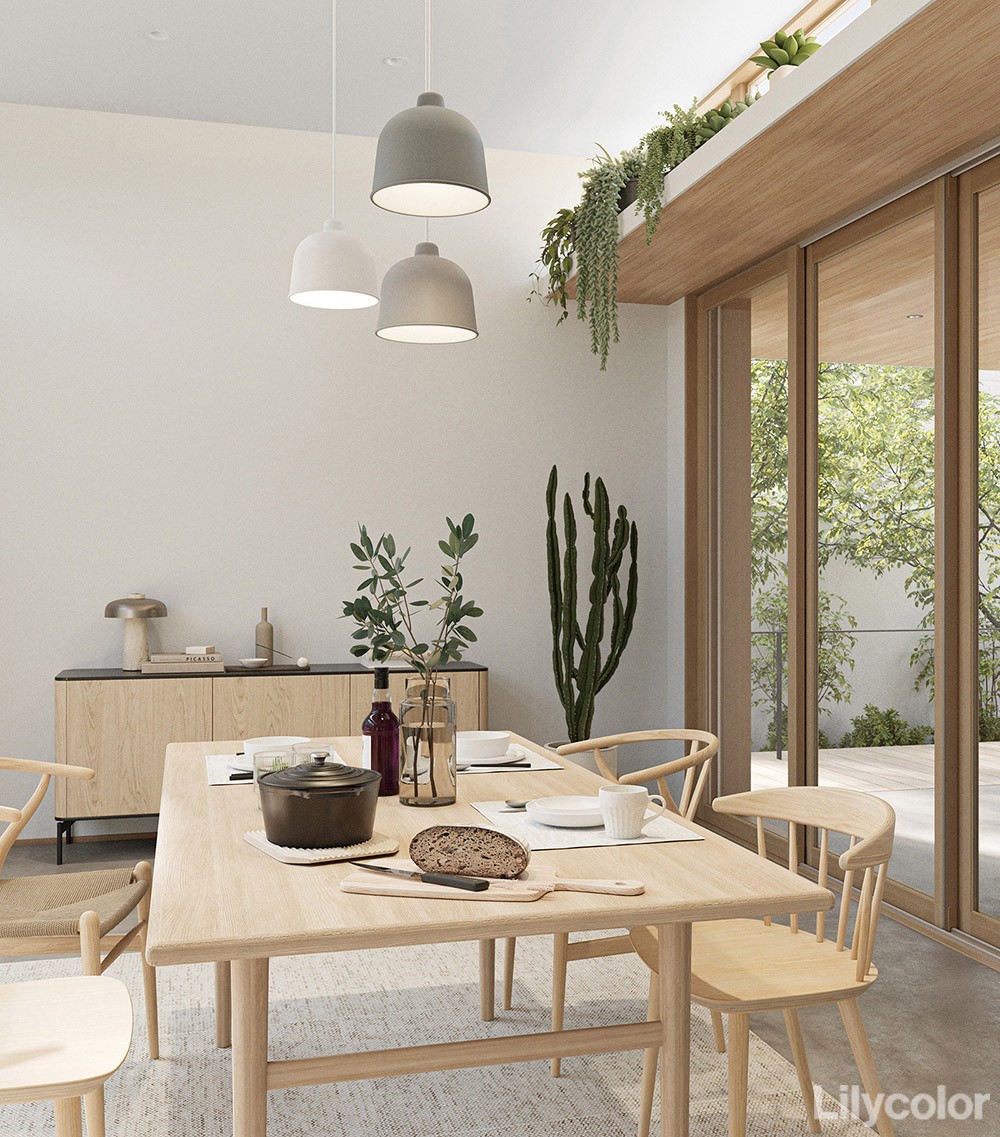 石の質感とナチュラルな家具を織り交ぜた洗練されたモダンリビング。コンクリートと岩石は一見クールでラグジュアリーなイメージですが、家具や床材をナチュラルなものにすることでリラックス空間にもなります。