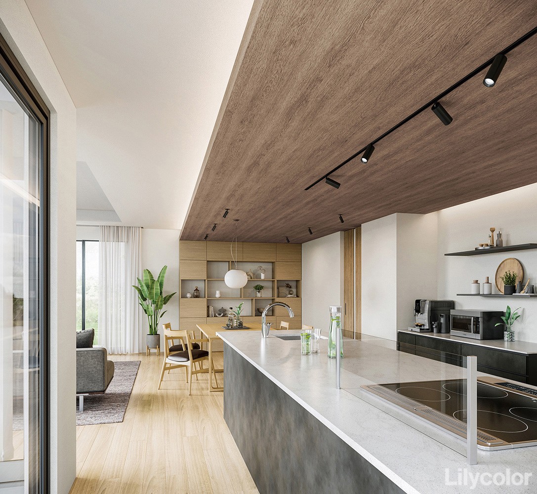 ボリューム感のあるオーク柄の壁紙は天井におすすめです。