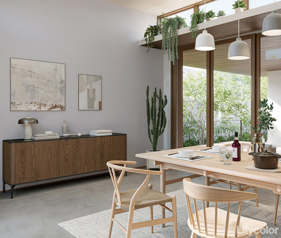 石の質感とナチュラルな家具を織り交ぜた洗練されたモダンリビング。コンクリートと岩石は一見クールでラグジュアリーなイメージですが、家具や床材をナチュラルなものにすることでリラックス空間にもなります。